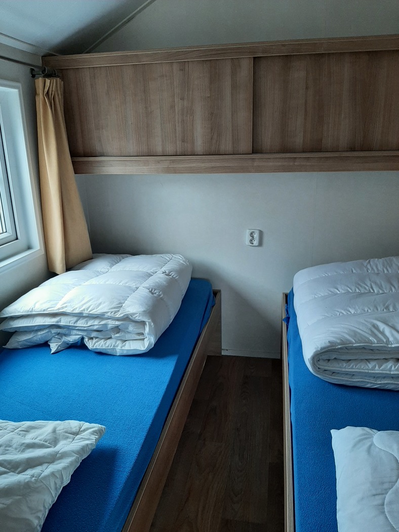 Geschikt voor 5 personen. Bevat 3 kamers, waarvan 2 slaapkamers. 1 slaapkamer met een 2 persoonsbed en 1 slaapkamer met 1x een 2 persoons bed en 1x een 1 persoonsbed. Badkamer met douche, toilet en wastafel.